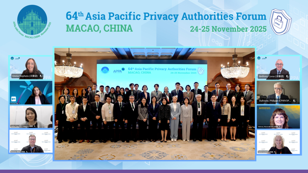 The Personal Data Protection Bureau, Macao, China, hosted the 64th Asia Pacific Privacy Authorities (APPA) Forum on 24 and 25 November 2025. The Forum was attended by 15 APPA members from across the Asia-Pacific region. Several guests and observers were also in attendance, including representatives from other data protection and privacy authorities, think tanks, industry, and academia. Over 1.5 days, participants discussed a wide array of global privacy issues, regulatory experiences, and enforcement challenges, particularly those arising from the use of artificial intelligence and other new technologies, youth privacy, cross-border data transfers, data protection by design, and different approaches to raising awareness in personal data protection. For details, see the 64th APPA Forum Communique.